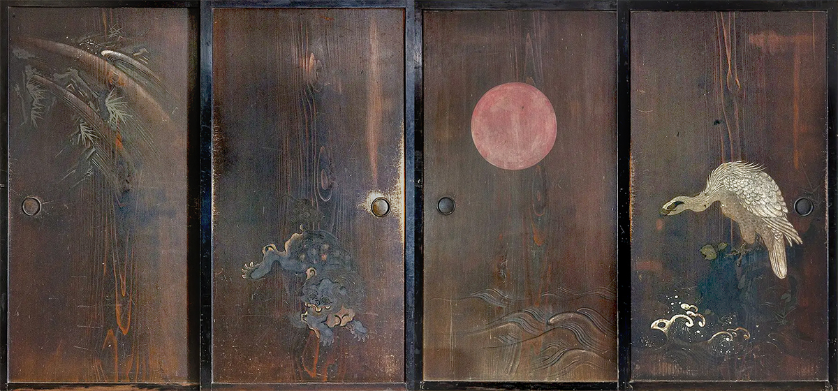 徳島城西の丸御殿に入っていたと伝わる、太陽と鷹、滝に獅子の画。杉の一枚板戸。