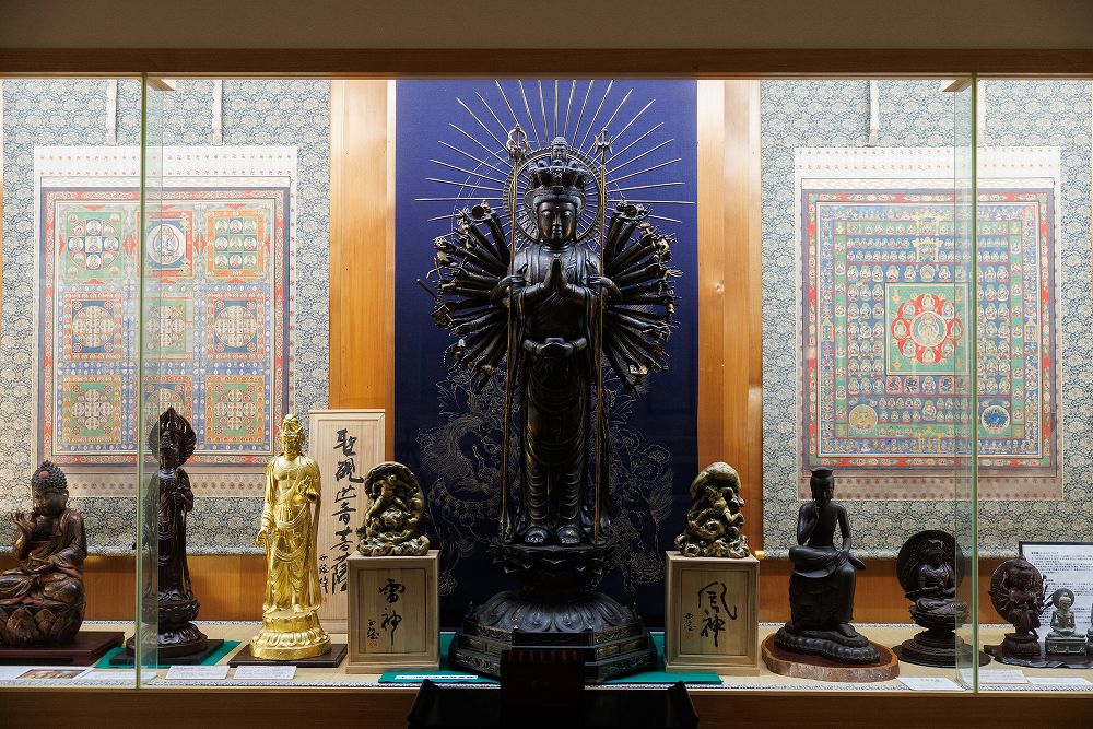 仏像は、1.4mの金剛界大日如来坐像、高さ1.8mの十一面千手観音、鎌倉中期の金銅仏の懸仏(12.2cm)、タイ国の金仏2体(44cm)、チベットの木像仏(58cm)を展示。